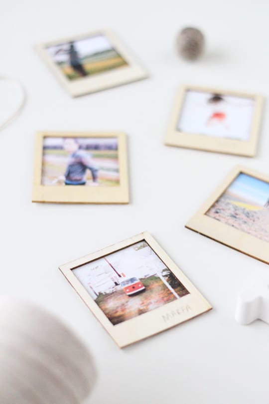 Print out photos at 2 3/4×2 1/4 inches on matte photo paper. Spread tacky glue on one side of a wooden polaroid frame and position over the photo and press firmly on all corners.